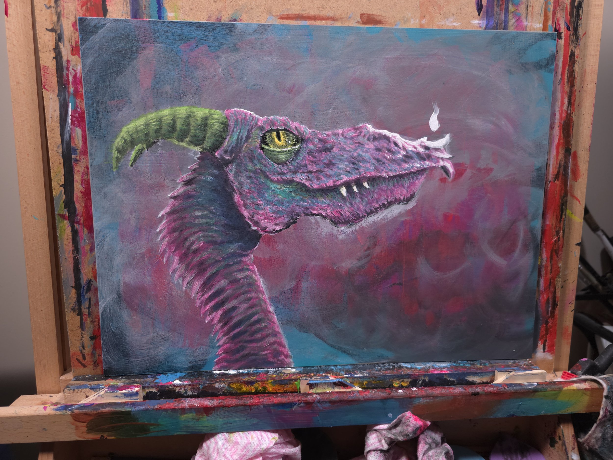 -The Fairy Dragon painting has progressed somewhat. I changed up the eye, and started putting color washes over the black and white. Since I’m using acrylics exclusively for this, the trick is going to be keeping the contrast good and avoiding muddiness. Can’t have a supposedly vibrant magical creature looking like a dried leaf, now can we? (can we?..hmm)