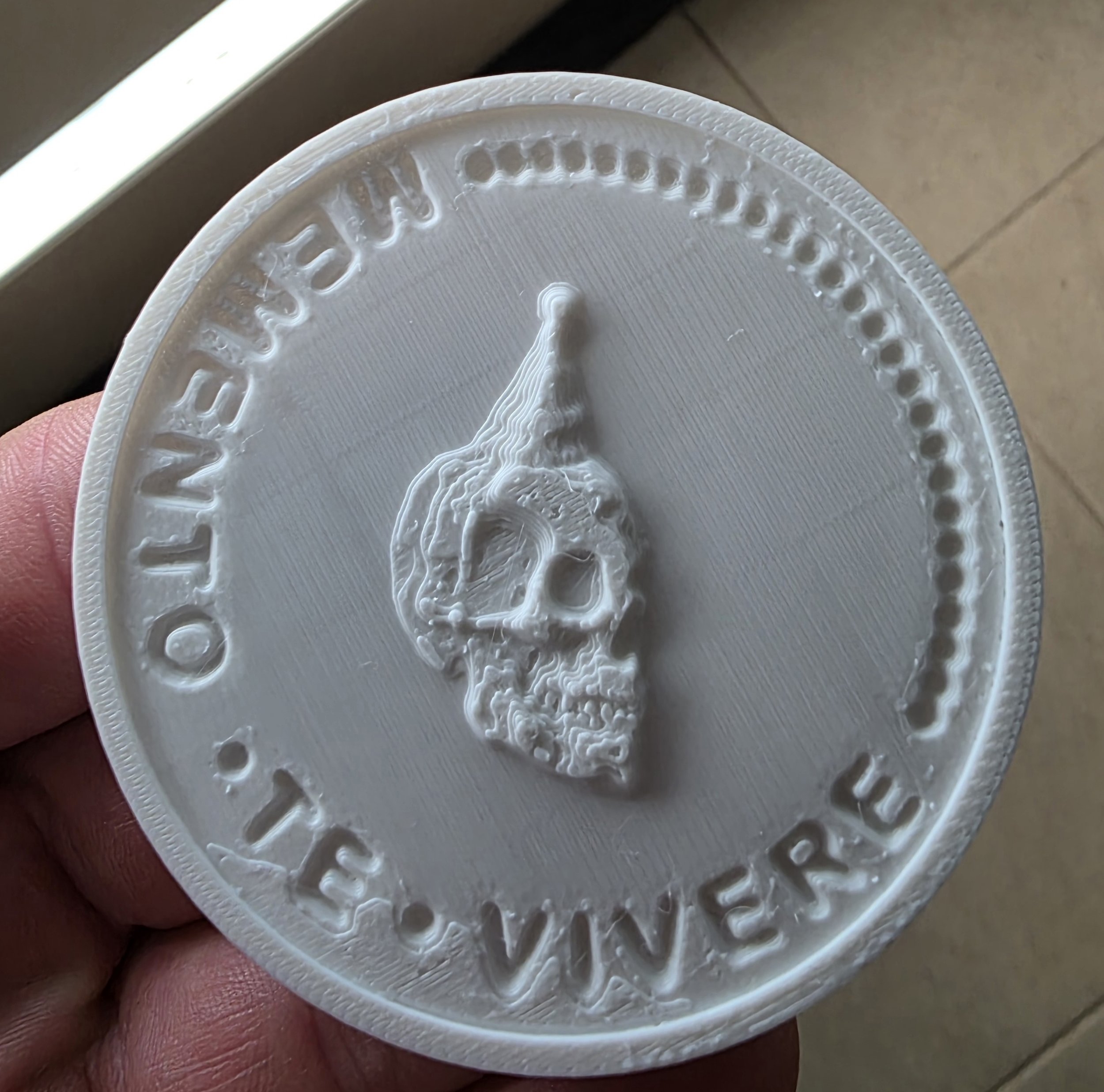 -I printed a test of my proposed market fridge magnet, despite some issues with my printer. I haven’t been into the 3D printing world very long, and aligning things by hand to print without supports is a little tricky sometimes. I plan to paint these with acrylics in several color variants. The motto is Latin for “Remember to live”